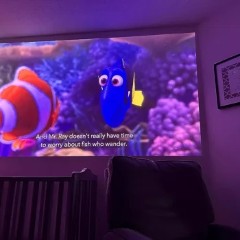 This mini project is like a wish granted by some tech genie! I mean, it's just extraordinary how something so compact can blow your mind with such an picture quality. You would think that my old battered and bruised wall wouldn't be the ideal surface for projecting anything worth watching. But guess what? This gadget proves otherwise. The visuals are so clear, crisp and vivid; they're absolutely sublime. It's almost as if you're in a cinema, but right at home! And let me tell ya', it doesn't matter whether you're streaming the latest blockbuster or catching up on your favorite TV series - everything looks fantastic. The WiFi and Bluetooth connectivity features are just icing on the cake. They make setting things up a breeze – no hassle of wires running all over the place or dealing with complicated setups. Just connect and voila - instant entertainment! Now about those movie nights with friends... well they’ve been taken to a whole new level thanks to this device. Everyone loves coming over because we get that big-screen experience without leaving the comfort of my living room (and let’s not forget about easy access to snacks!). All I have to do is whip out my phone, connect it to this nifty piece of tech via WiFi or Bluetooth, select our film of choice and bam - we’re transported into our own private theatre.