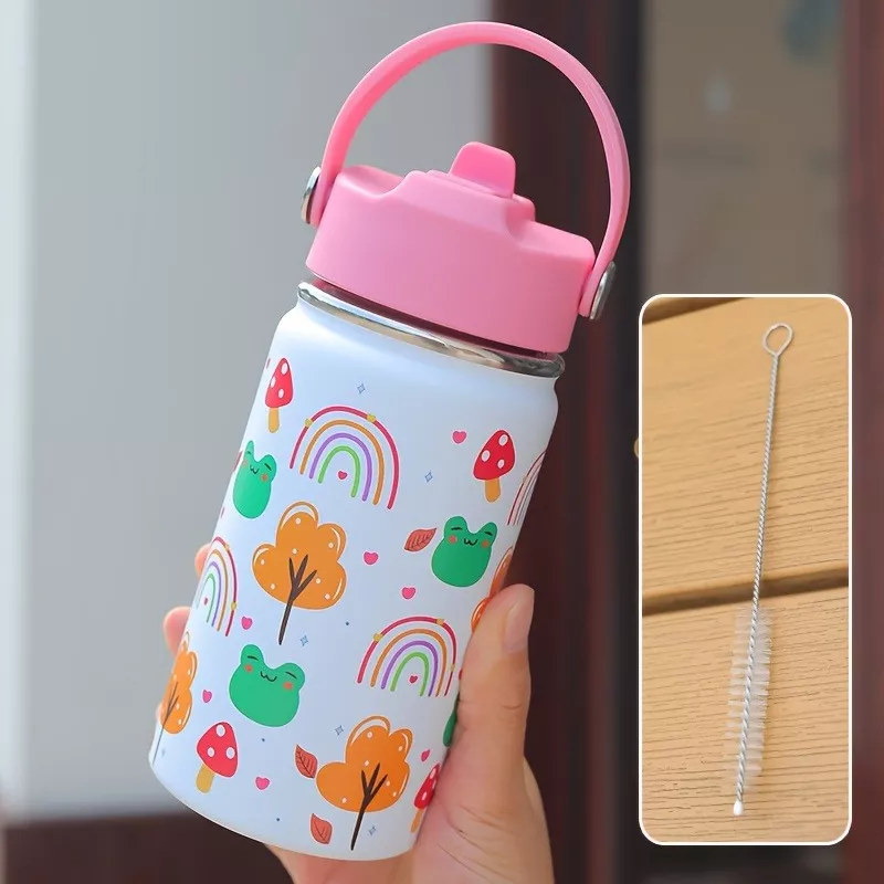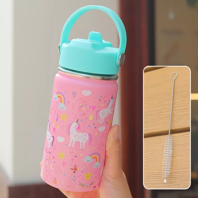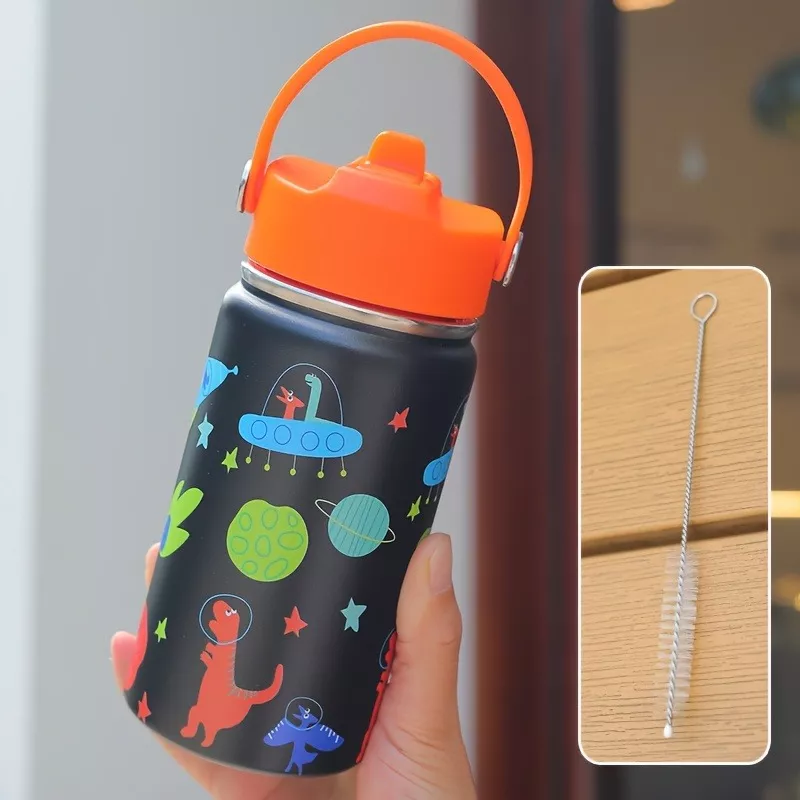 This insulated water bottle is designed to make hydration easy and fun. Its compact 7.5 x 20.5 cm (3 x 8 in) size fits perfectly in school bags, lunch boxes, and car cup holders. The straw lid makes it spill-resistant and easy for kids to drink without help. Because it is made from safe stainless steel with no harmful chemicals, parents can feel confident about their child’s daily use. The bottle is reusable, eco-friendly, and easy to clean, making it a smart choice for busy families.