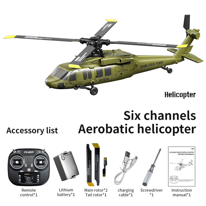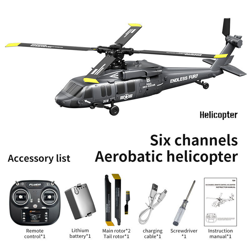 Powered by a brushless motor, this RC helicopter delivers incredible power and long-lasting performance with minimal maintenance. The six-channel control allows for a full range of motion, including one-click inverted flight, so you can perform flips, rolls, and dynamic stunts like a pro. Every detail of this model is designed to simulate real helicopter performance, giving you an immersive flying experience that feels authentic and thrilling.