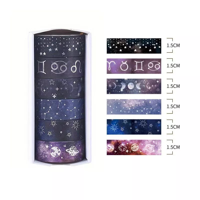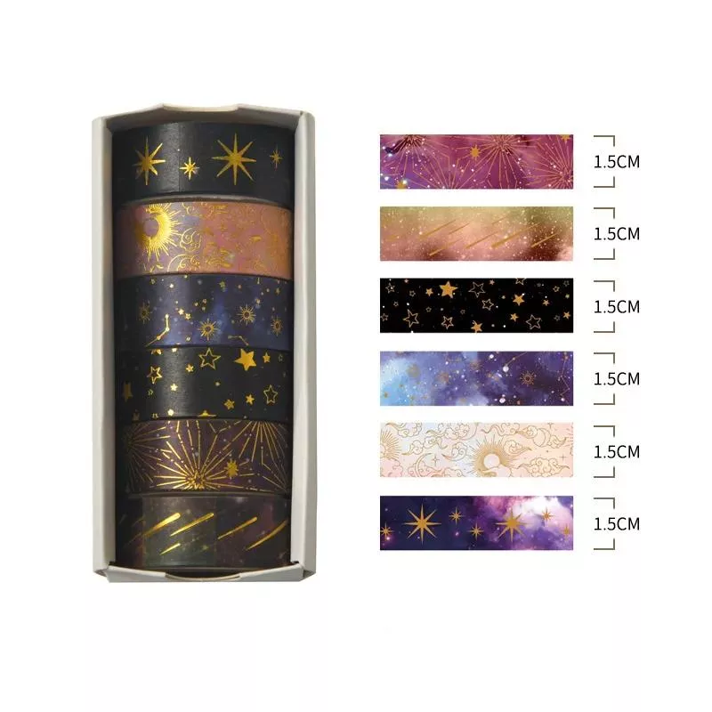 Let your creativity shine with this dazzling Starry Sky Washi Tape Set. Available in a 6-roll or 12-roll option, this collection features enchanting star patterns and shimmering foil accents that bring a dreamy, celestial feel to your journaling, scrapbooking, or DIY crafts. Perfect for stationery lovers, students, and crafters of all levels, these tapes are designed to turn your ordinary pages into magical creations.