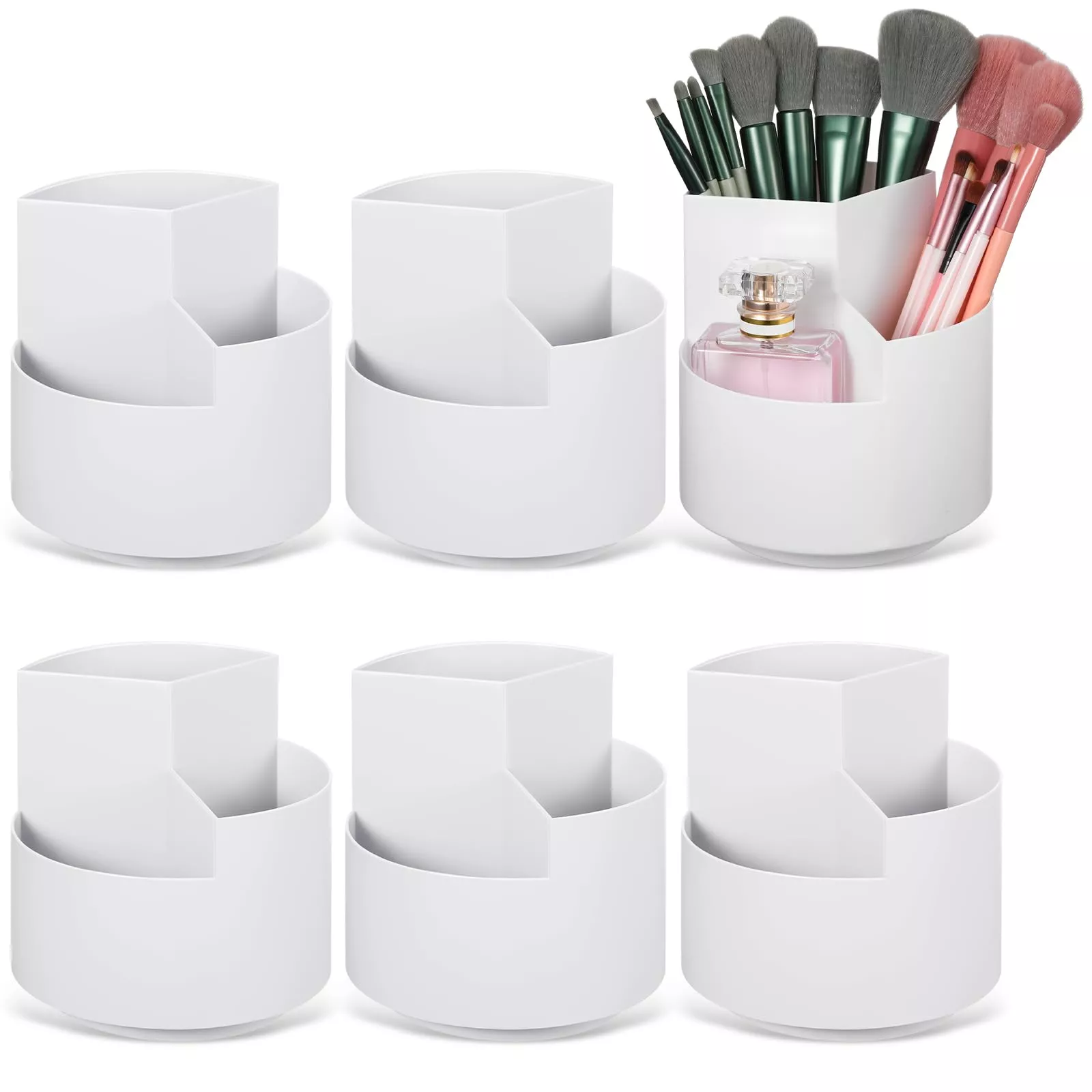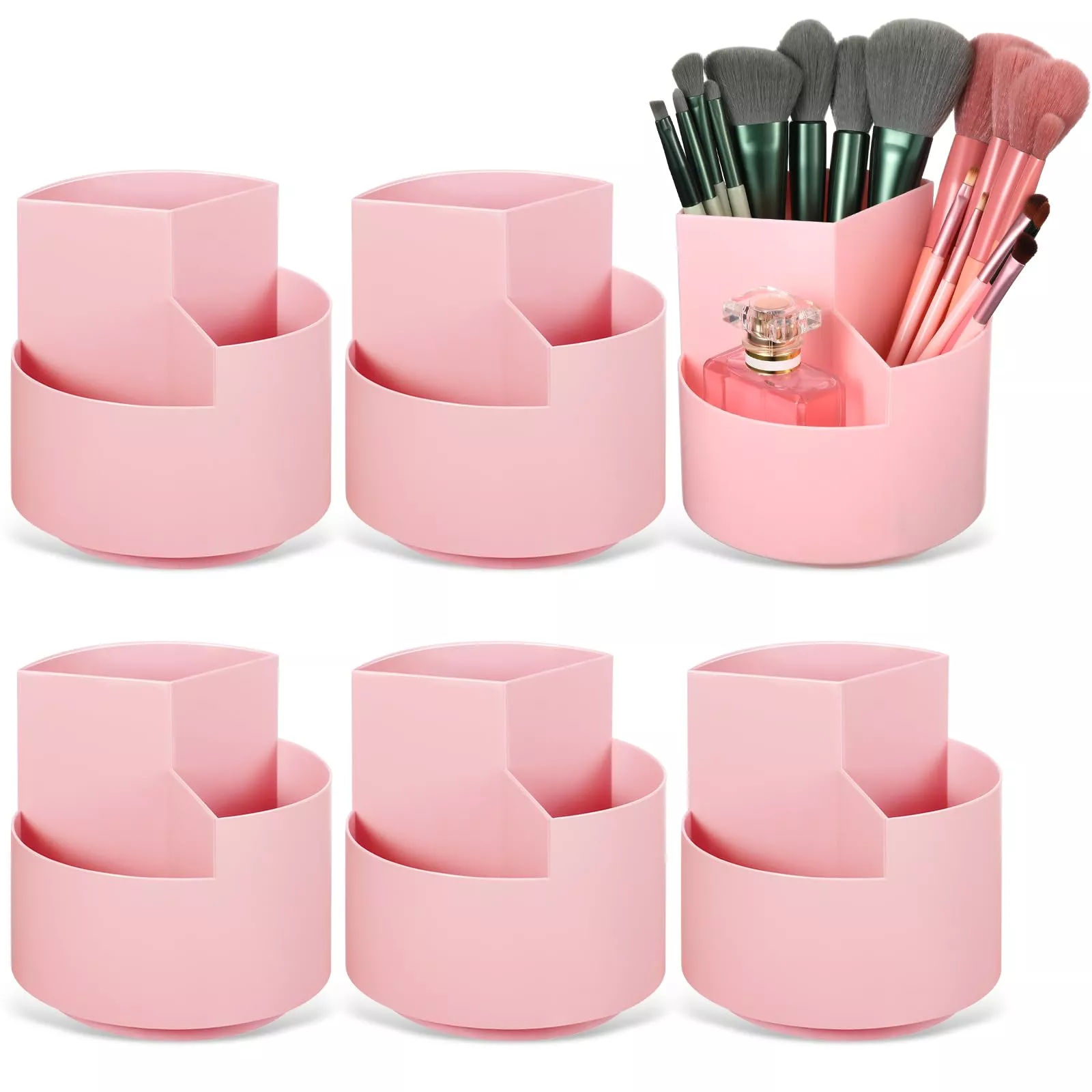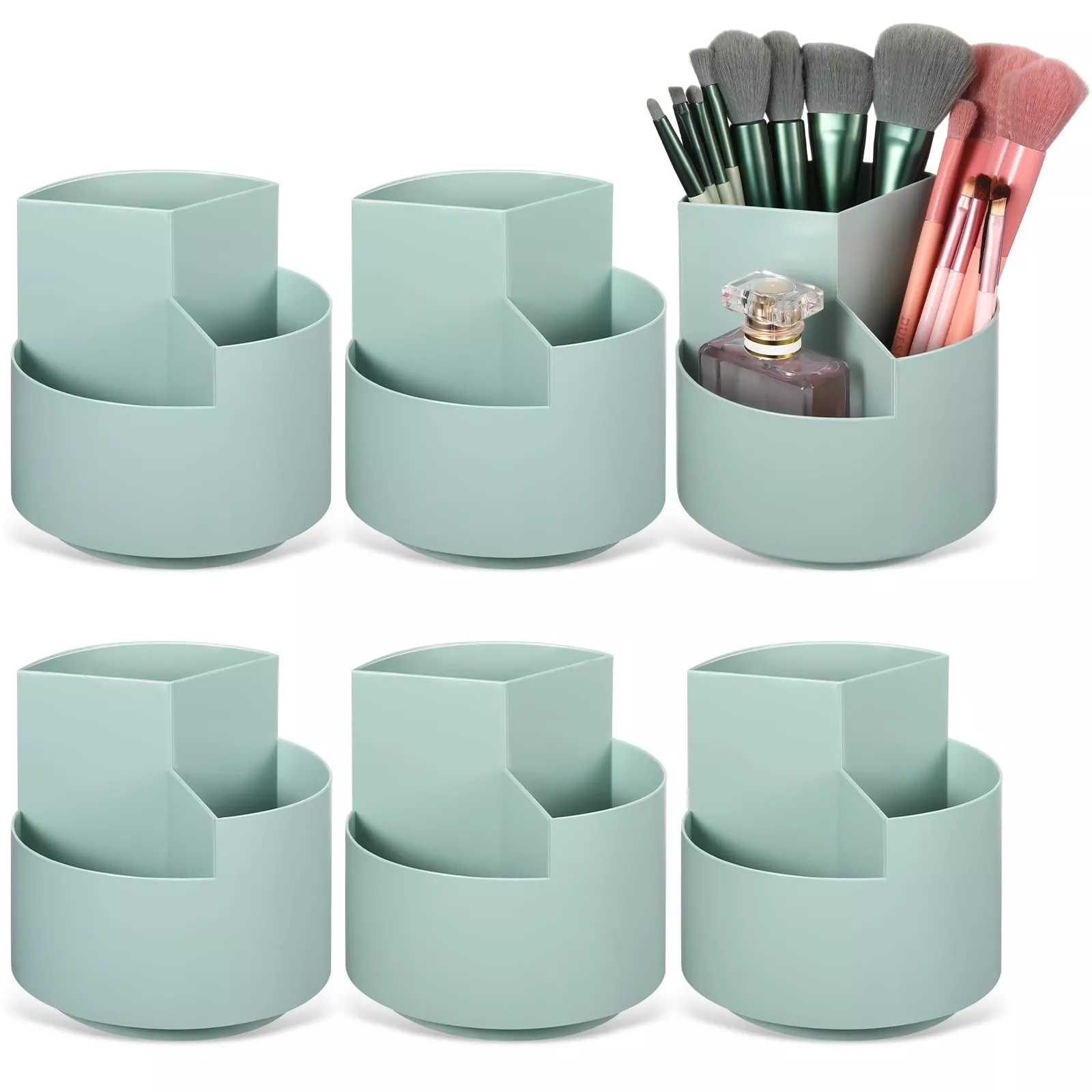 Transform your workspace or vanity with this 6-piece rotating pen and makeup brush holder set. Designed with a clean and modern Japanese-inspired style, these holders not only keep your essentials organized but also add a touch of charm to any desk or countertop. Each holder features 3 spacious slots to store pens, pencils, markers, makeup brushes, or even small tools. The 360-degree spinning design allows you to easily access everything you need with just a quick turn, making it both practical and fun to use.