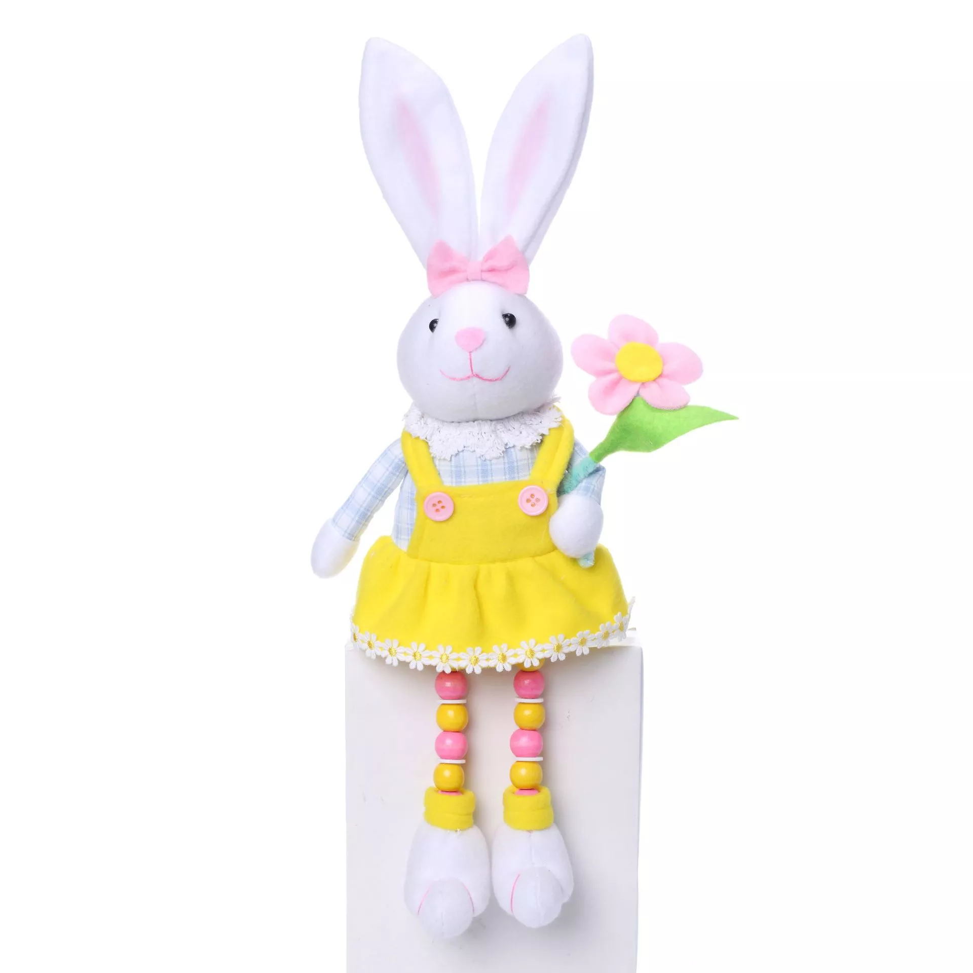 This plush bunny is made with a soft, non-woven fabric and filled with plush cotton for a huggable feel. Its legs are filled with sand and gravel to keep it in place, while the wooden beads add a rustic charm to its design. The adorable bunny measures 17 inches tall, making it the perfect size for decorating any space, from your mantelpiece to your office desk. Its cute expression and beautiful detailing with the radish and flower make it a standout piece for any room.