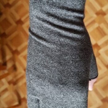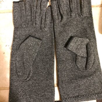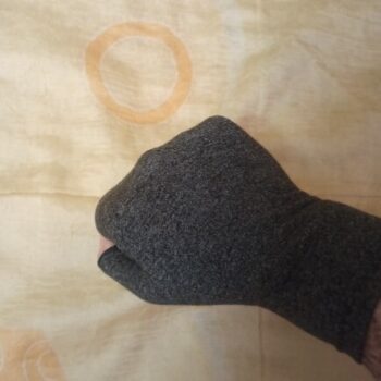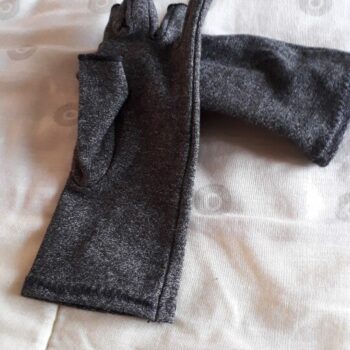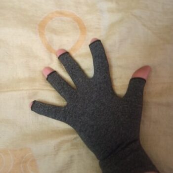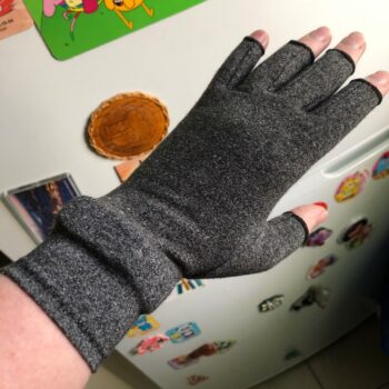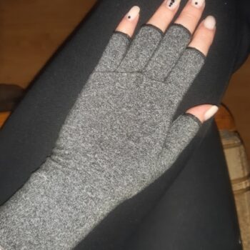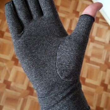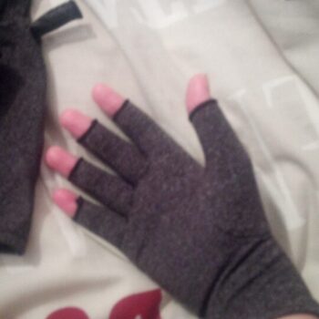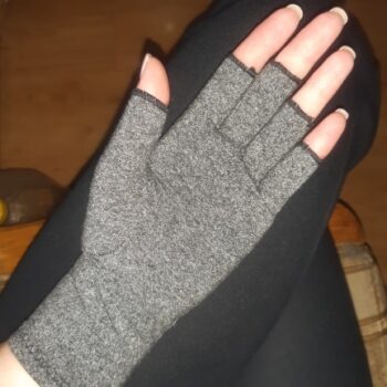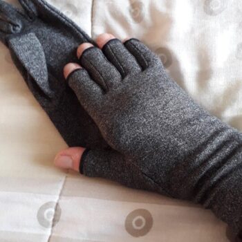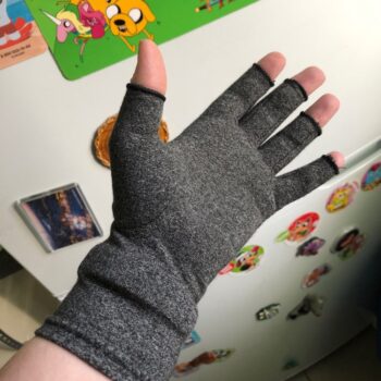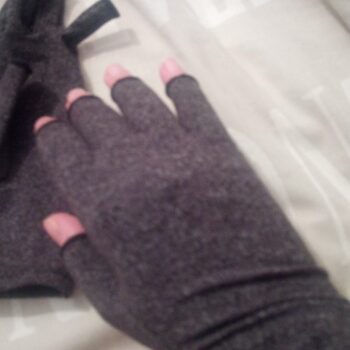 I was concerned with how small these looked when I took them out of the package (I ordered according to the sizing chart) but they fit perfectly! The fabric of these compression gloves is lovely and soft. The stitching all seems strong and all the seams lay flat so they won’t dig into your skin and cause irritation. The gloves were a bit hard to get on but that is probably because they’re brand new. My hand is just a smidgen over 3 inches wide at the knuckles so I ordered small and it was exactly the right size. The moment the glove was on, I felt almost instant relief from the pain in my knuckles and fingers. The gloves are designed with a left and right hand, rather than a interchangeable shape, which means that they fit properly around the thumb. I really like how the length of the fingers on the gloves comes up so high, providing extra warmth and comfort for the middle knuckle and a bit of the top knuckle too. Keeping the finger tips exposed means that I can type and pick things up without worry. Because the fabric is mostly cotton, it breathes well and doesn’t leave you with clammy hands. When needed, hand wash in cold water and air dry so that the elasticity doesn’t go out of them, and they won’t shrink.