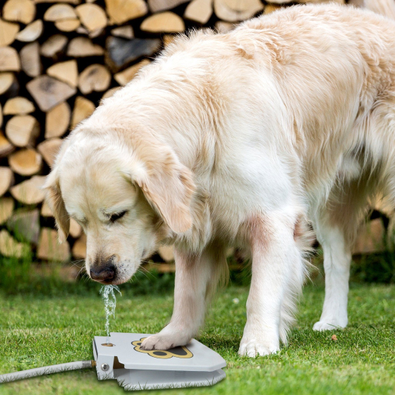 Teach your dog to step onto the printed-paw pattern of the water fountain to dispense water. Each purchase includes some training instructions you can follow to ease your pooch into using the fountain. With time, he or she will be stepping on the fountain pedal naturally for a sip of water!