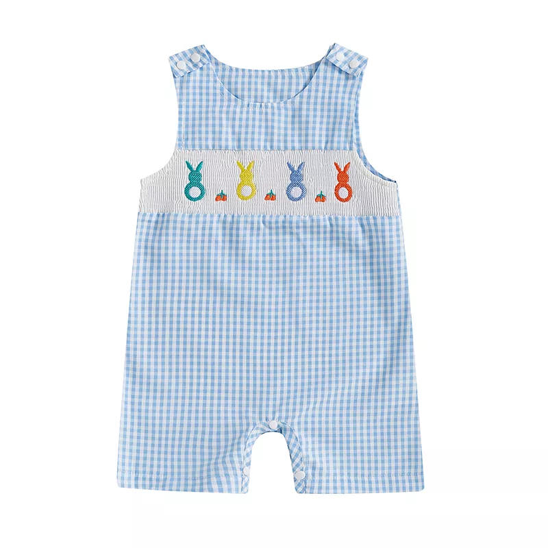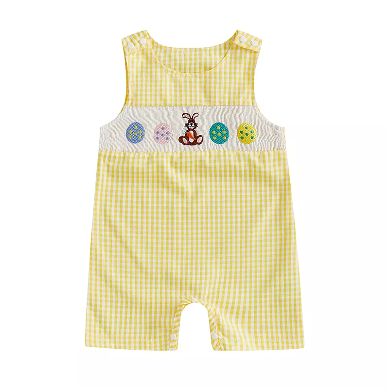 Celebrate your baby’s first Easter in style with this charming sleeveless romper! Designed for both baby boys and girls, this festive jumpsuit features delightful egg and bunny embroidery on soft plaid fabric, making it perfect for springtime fun, family gatherings, and Easter egg hunts. With its comfortable crewneck design and easy snap closure, dressing your little one has never been easier—or cuter.