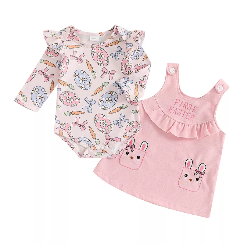 • Adorable egg print on romper and sweet bunny embroidery on the dress