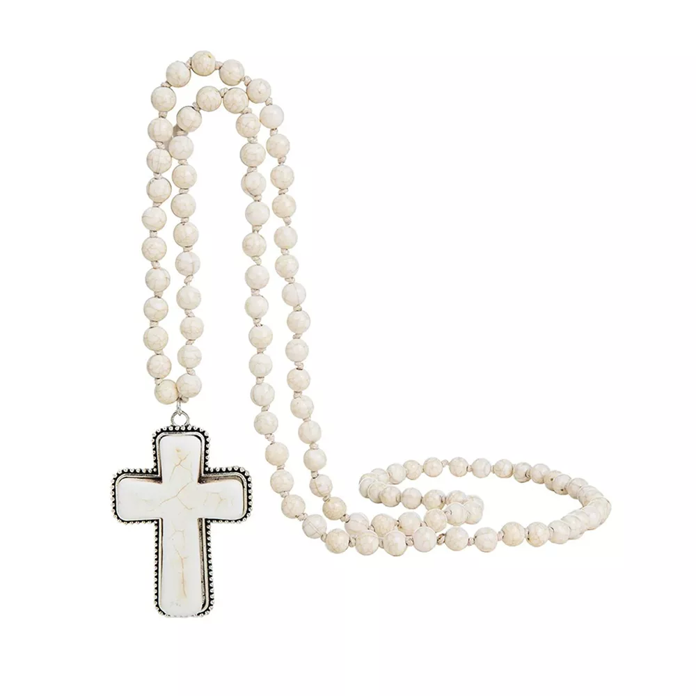 Bohemian Prayer Necklace with 8mm Turquoise Beads & White Turquoise Cross Pendant
