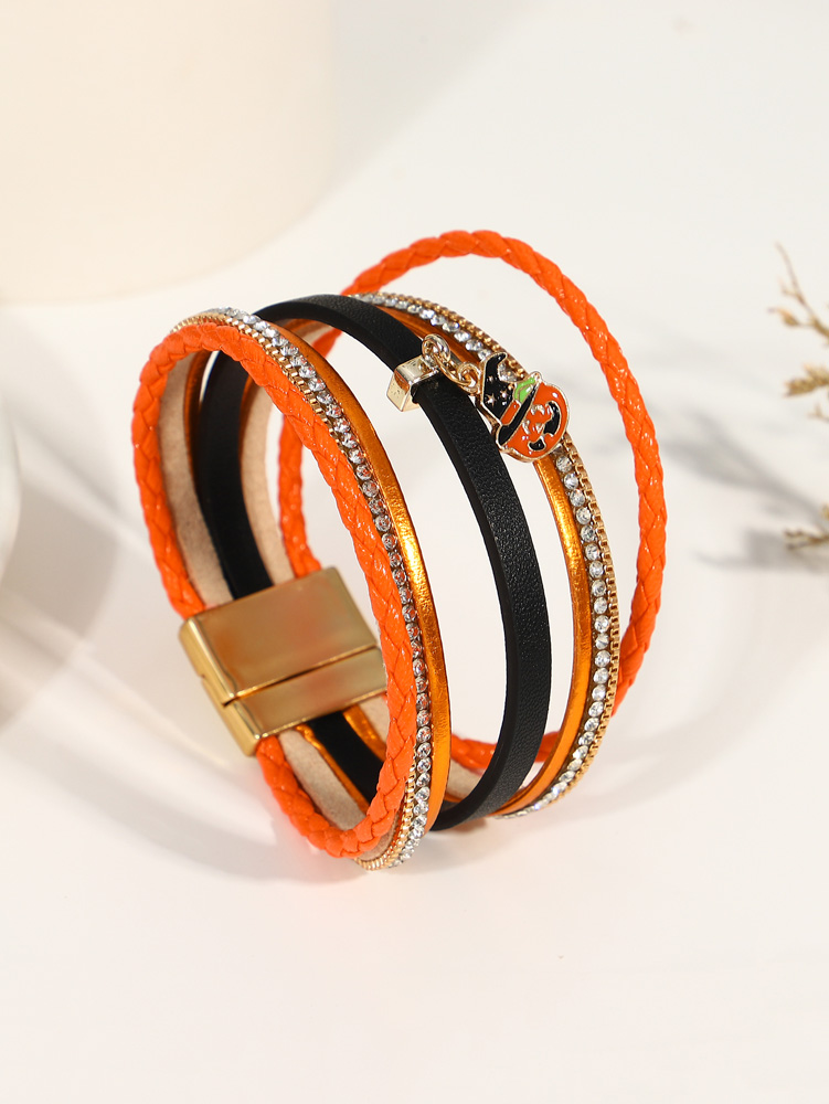 Embrace the spirit of the season with this stunning Boho Leather Wrap Bracelet, featuring playful pumpkin charms and sparkling crystal chains. Designed for women who love unique, expressive accessories, this bracelet perfectly blends Halloween charm with timeless bohemian elegance. Crafted from soft PU leather and durable alloy, it wraps comfortably around your wrist for a stylish, layered look that’s both chic and festive.