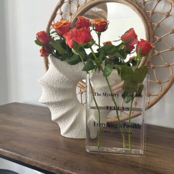 This elegant transparent acrylic book vase has been nothing short of amazing since day one when we introduced it into our home dรฉcor scheme. Itโs a standout piece that adds character and charm wherever you place it due to its artistic touch inspired by Nordic designs โ truly endless possibilities for use! And despite being lightweight enough for easy portability between rooms (or even outside), thereโs no compromise on durability thanks to sturdy construction that resists breakage effectively ensuring long service life; maintaining cleanliness too is effortless because acrylic can be easily wiped clean whenever required making sure your favorite decoration always looks best.