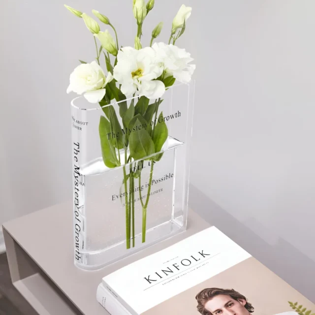 I've been looking for a unique vase to add some flair to my home, and this one does the trick. The book shape is so distinctive, it's like having a piece of modern art on display. Plus, it's made from durable acrylic material that can withstand any accidental bumps or knocks - very impressive!