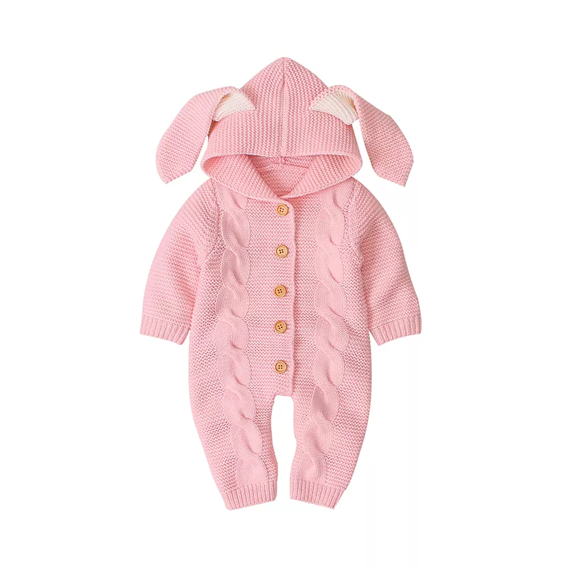This knit romper is designed for crisp autumn days, offering warmth without overheating. Whether layered over a onesie for extra coziness or worn on its own, it’s the perfect outfit for strolls, playdates, and snuggles at home. Plus, the adorable hood with ears adds a fun and playful touch, making it a delightful choice for seasonal photos.