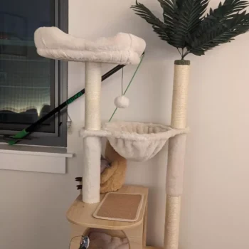 Our product stands out for its thoughtful design and superior quality. It combines a spacious cabinet large enough for a comfortable sleep or to discreetly house a litter box, a foldable litter box included for convenience, and multiple scratching posts wrapped in natural sisal rope for your cat’s scratching needs. The tree also features two top options, including a coconut palm leaf top, and a variety of lounging spots like a large-space top perch and a capacious hammock. Crafted from healthy and eco-friendly materials, it ensures your cat’s well-being while adding a stylish touch to your home decor.