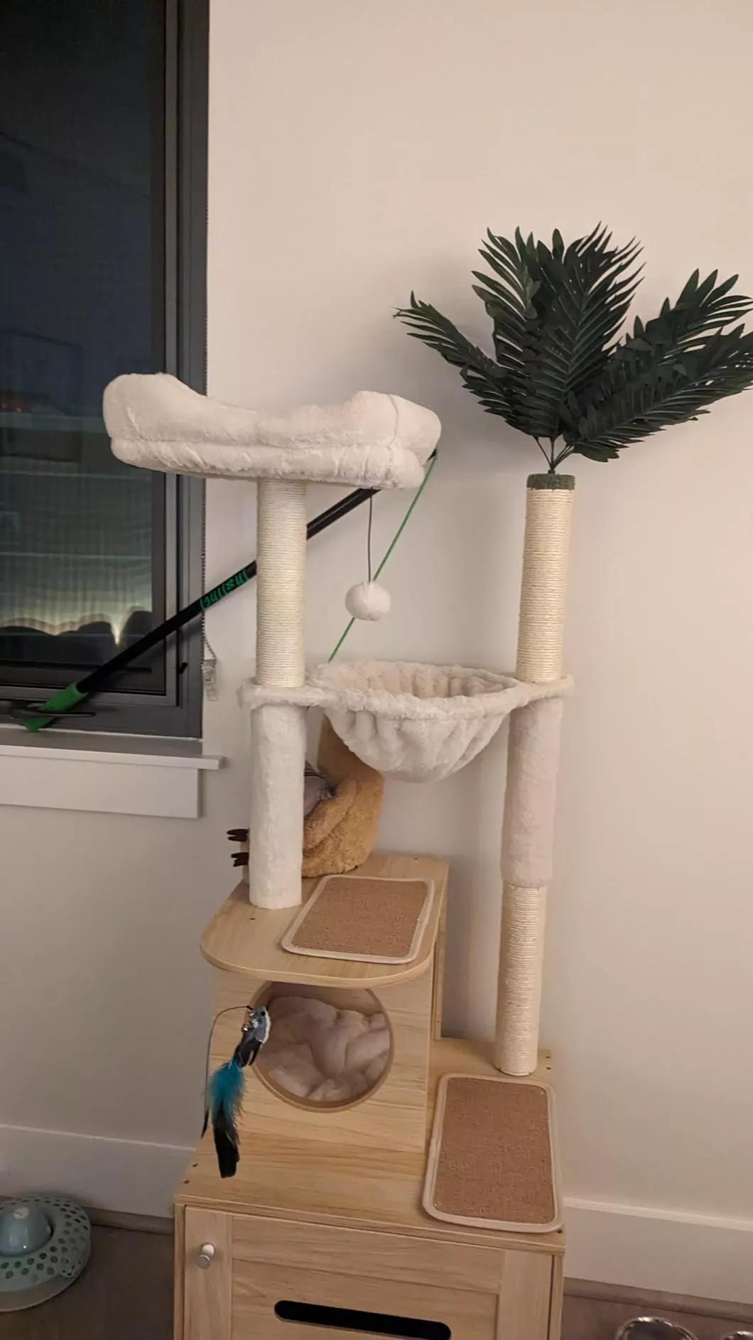 My big 14-pound, 11-year-old furball absolutely digs his new hangout spot. He's all about sleeping on the top platform, so it's a relief this thing's got some serious stability! Everything needed for setup was in the box, clearly marked and easy to figure out. They even threw in a wall anchor, which is pretty thoughtful. The litter box area's got plenty of space and comes with a waterproof liner you can pull out to clean, which is genius for keeping any mess off the wood. Plus, cleaning it's a breeze. They even packed in a couple of toys—one as a spare for when the first one's had it. There's a bunch of scratch posts and a scratch pad you can stick on with double-sided tape. It also comes with soft mats for naps that attach the same way, though I'm on the fence about the tape—wondering how it'll hold up to washing after those inevitable accidents... Having the litter box tucked away under the cat tree is a space-saver and keeps the litter out of sight, making this whole setup a solid win in my book. Solid 5/5.