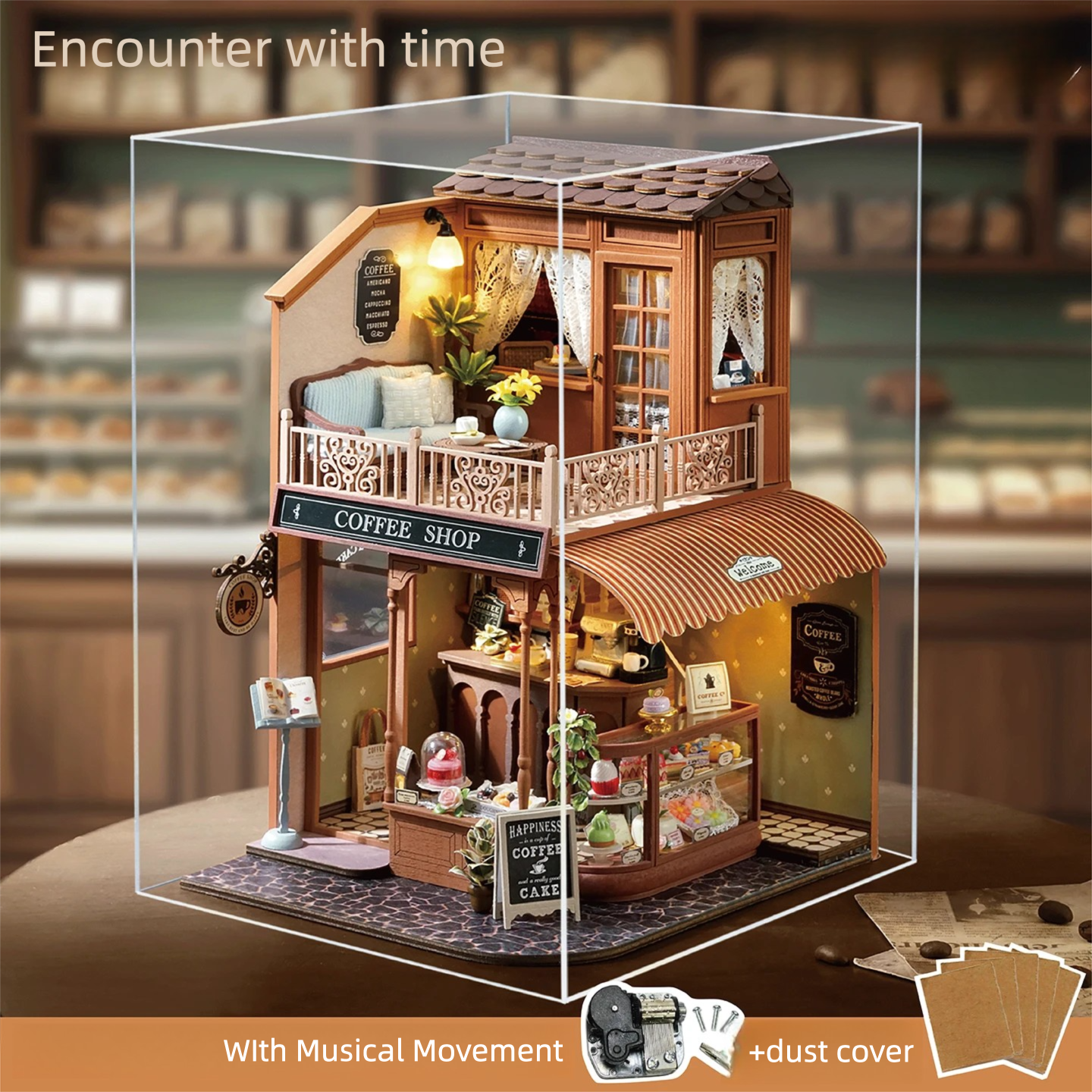 Crafted from high-quality wood, every piece is precision-cut for easy assembly and lasting durability. The natural wooden texture gives it a warm, authentic look, while the included music box adds a touch of nostalgia and serenity to your creation. Perfect for ages 14 and above, this kit isn’t just fun—it’s educational, too! It encourages problem-solving, fine motor skills, and patience as you bring your café to life.