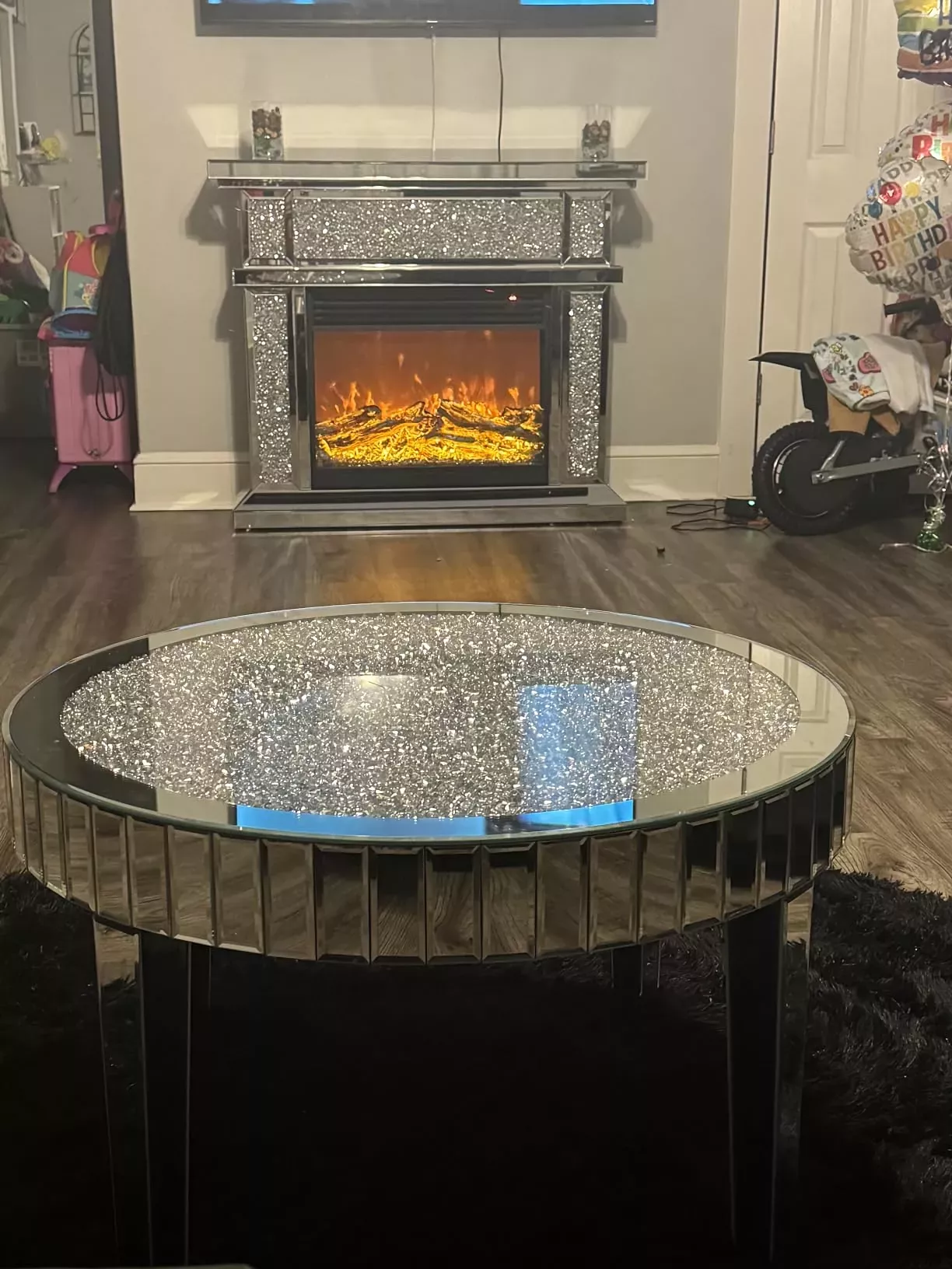 Crafted from high-quality materials, this coffee table features a durable MDF board and glass construction, ensuring long-lasting use. The mirrored surface is complemented by intricate crystal inlays, providing a unique and elegant touch. Measuring 31.5 inches in diameter and 18.3 inches in height, it fits perfectly in various rooms, including the living room, office, lounge, and sitting room. With a weight capacity of up to 110 pounds, it can hold your favorite decor items, books, and more.