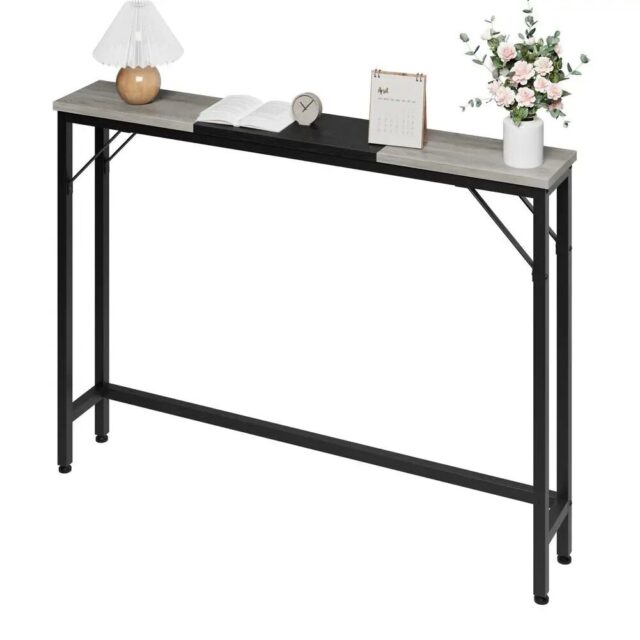 Our Elegant Slim Console Table stands out with its color block design, blending grey and brown tones to create a piece that complements any decor style. The antique look adds character, making it more than just a table, but a statement piece. Additionally, its sturdy construction ensures durability and long-term use, making it a valuable addition to your furniture collection.
