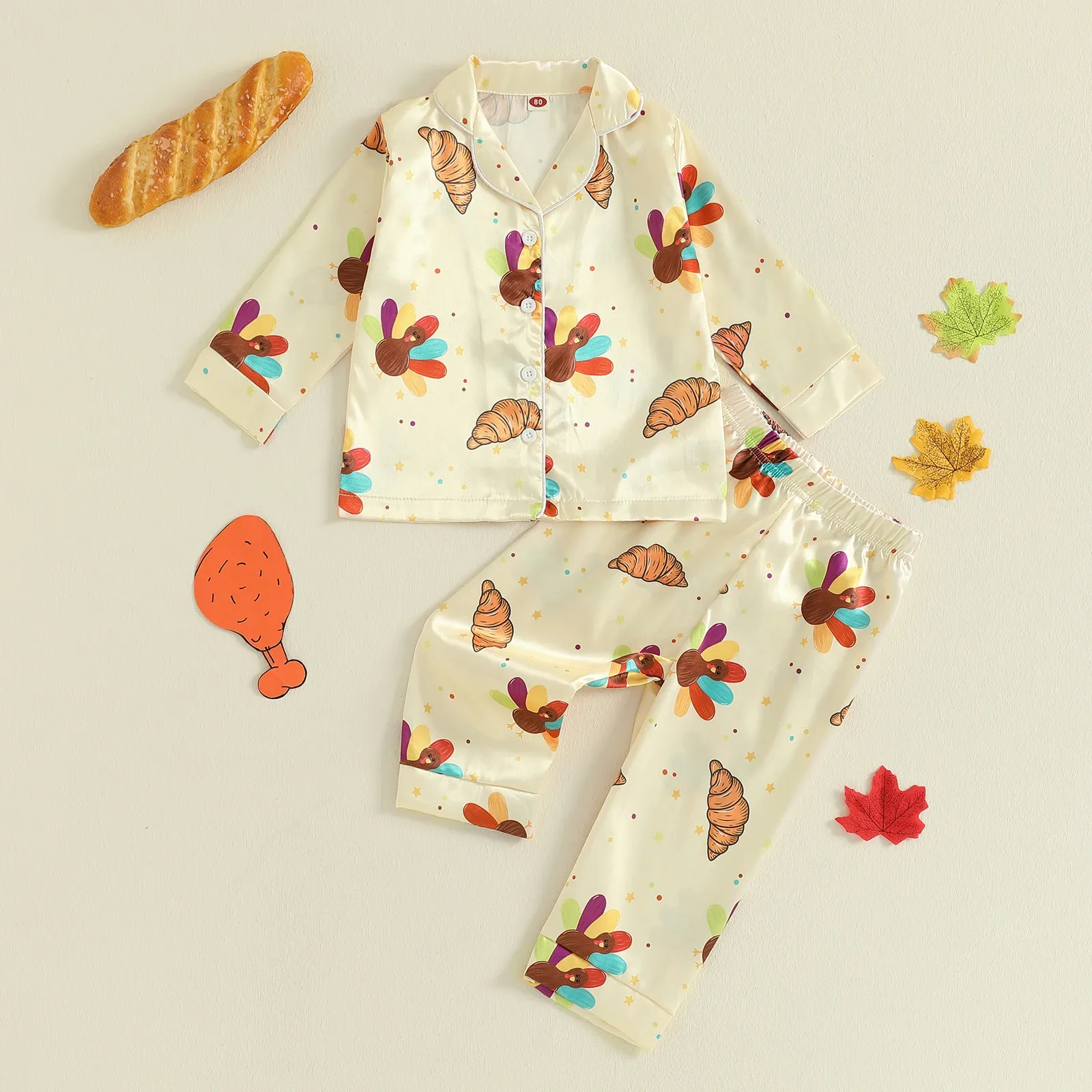 Girls 3-Piece Thanksgiving Outfit Set – Turkey Print Skirt, Long Sleeve Top & Headband