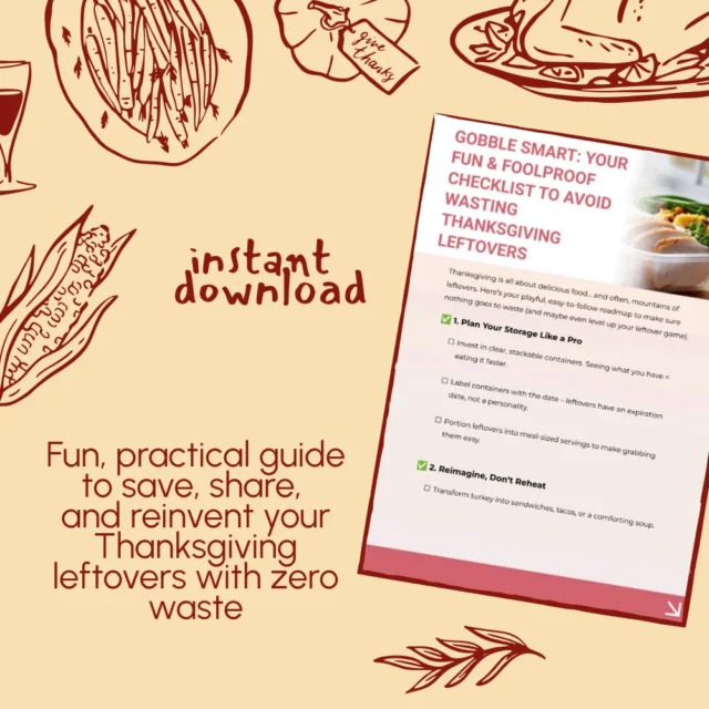 Thanksgiving is a time for family, gratitude, and—let’s be honest—piles of delicious food. But after the feast, what happens to all those leftovers? Enter Gobble Smart: Your Fun & Foolproof Checklist to Avoid Wasting Thanksgiving Leftovers — your ultimate digital guide to turning post-holiday chaos into creative, zero-waste deliciousness. This downloadable checklist makes it simple (and even fun) to learn how to avoid wasting thanksgiving leftovers while saving time, money, and fridge space. Whether you’re hosting or helping, this is your roadmap to a smarter, tastier, and more sustainable holiday season.
