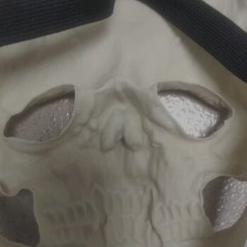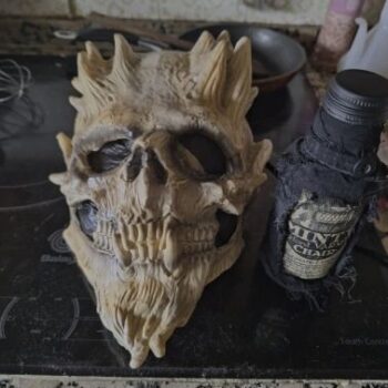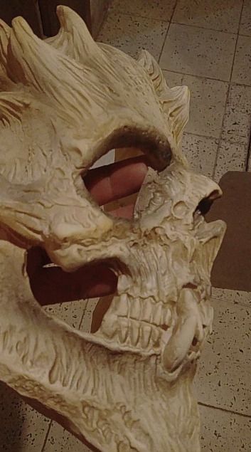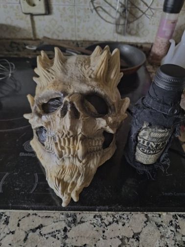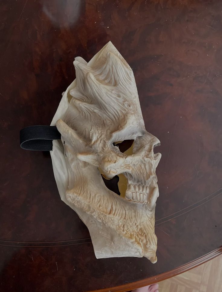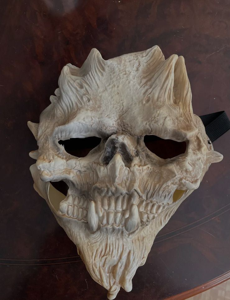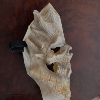 The mask is lightweight, flexible, and features impressive 3D details. Some additional shading on certain surfaces could enhance its appearance further. Adding black around the eyes and nose can create a fantastic effect.