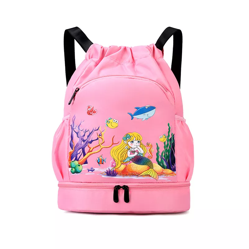 The backpack is made from durable, waterproof polyester to keep belongings safe and dry. It has a special dry and wet separation compartment, so wet swimsuits or towels never mix with clean clothes. An independent shoe compartment keeps shoes or sandals stored separately for better hygiene. The adjustable straps allow kids to wear it as a backpack, shoulder bag, or carry it by hand.