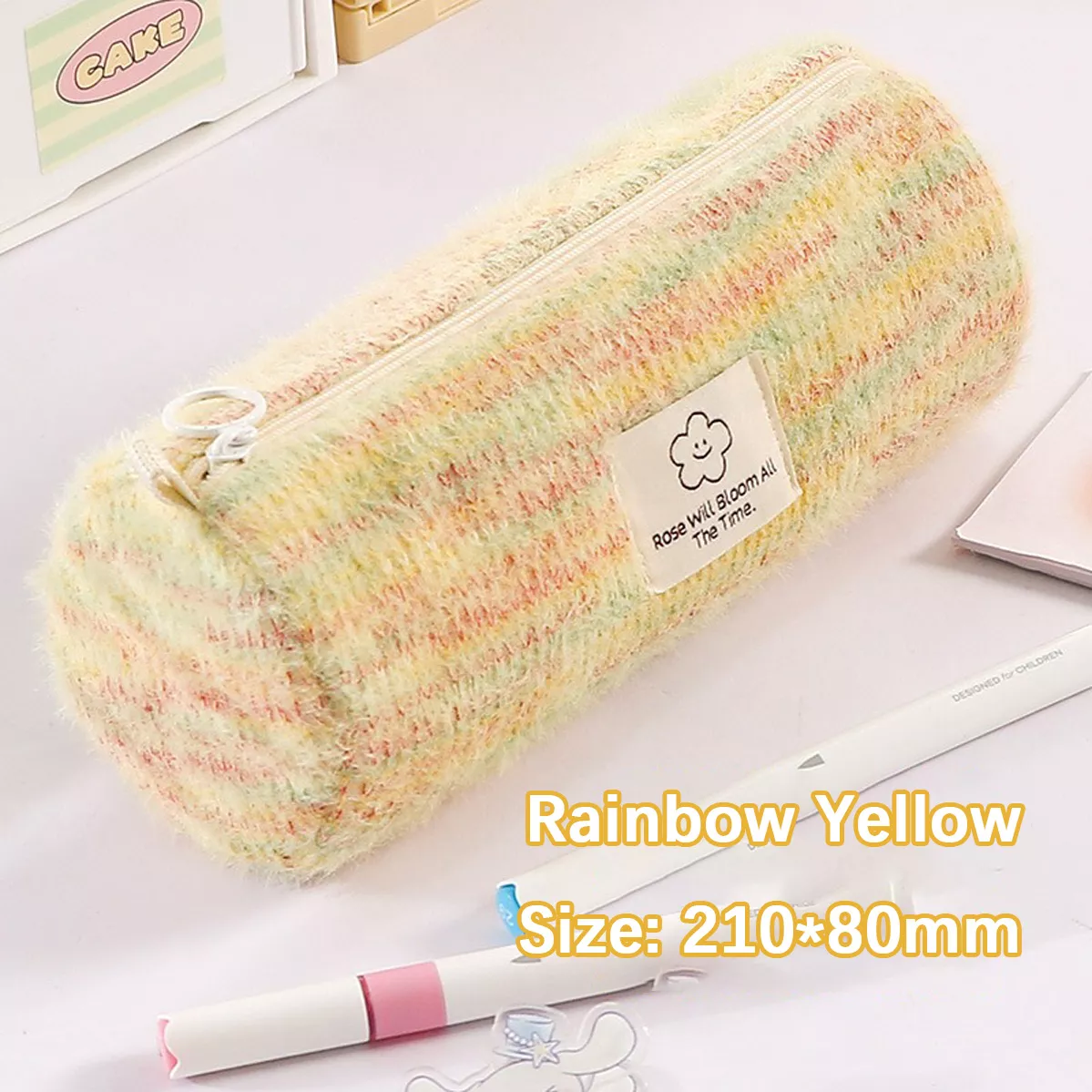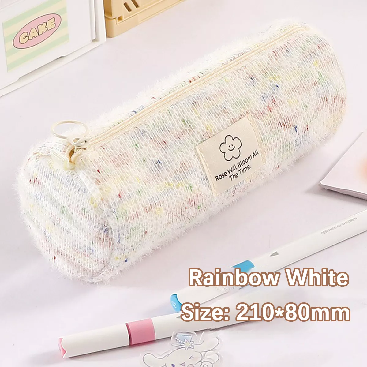 Large Capacity Kawaii Fluffy Rainbow Pencil Case for School Girls