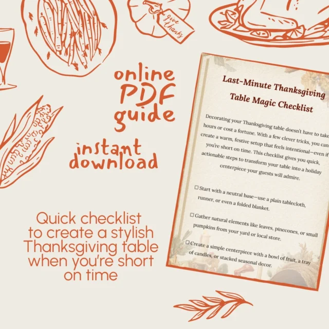 Hosting Thanksgiving but short on time? The Last-Minute Thanksgiving Table Magic Checklist is your stress-saving solution. This digital download gives you quick, practical steps to turn your table into a warm, festive centerpiece that feels intentional without hours of effort or expensive décor. Whether you’re welcoming a large group or an intimate dinner, this guide shows you exactly how to decorate Thanksgiving table last minute—with smart strategies, creative hacks, and sustainable tips that help you save time, money, and even reduce food waste.