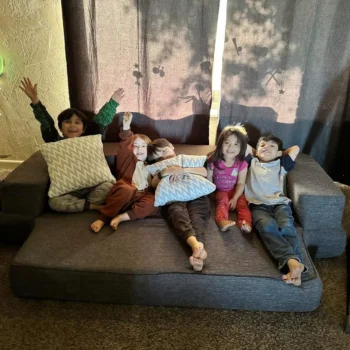 I bought this, hoping to replace the broken saucer chairs that were in my children’s playroom. Upon delivery, I brought the box inside, opened it, and inside was a very tightly packaged and tightly wrapped sofa bed. I cut the plastic with my fingernail as I didn’t want to risk cutting it with a scissor or a knife. Recommend not to use those things. The tiny sofa couch immediately started puffing up getting nice and puffy. I use tiny hair very loosely because it is quite huge. When it first puffed, it grew immediately into a queen-sized bed. I laid in it for two minutes and it was very comfortable. I would definitely sleep on it if needed. However, I did not buy this sofa bed to use as a bed only as a couch for my children in their playroom. I had a bit of trouble figuring out how to turn it into the sofa as the pictures provided gave me zero instructions on how to do that. there is a zipper in the crevice that you need to unzip in order to get it to fold forward to create the back of the sofa. Once that was done, the sofa remains the sofa and it is very difficult for it to lose its form. My children immediately piled upon them as you can see in the picture I have three average-sized 7-year-olds and two 3-year-olds that can all fit onto this sofa bed very comfortably. it’s quite a large size very comfortable. at a later time in the future, I will try to get a picture of my teenagers on the sofa to compare the size Fun fact it also comes with two small pillows that are very soft and incredibly cute. My children are absolutely in love with this sofa. Mind it is the first day and I cannot review its durability, although I am always updating my reviews. I will come back in a few months to tell you how well it held up against my demonic children . I am not using this sofa bed as a bed, so I cannot attest to it as a bed aside from laying on it for two minutes.