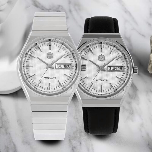 At its core is a reliable automatic mechanical movement, delivering smooth performance powered by your daily motion. The striking white dial features a deep press grid texture and refined trapezoid indices, enhancing the watch’s visual depth. A day and date window at 3 o’clock ensures you stay effortlessly organized, while sapphire crystal glass with anti-reflective coating keeps the view sharp and clear from every angle.