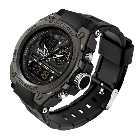 This men’s digital sports watch supports both digital and analog displays. It provides two different time zones for simultaneous setup and reading, with stylish personality, military-style, sports dial design.