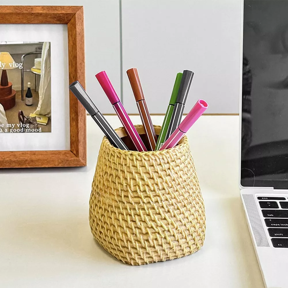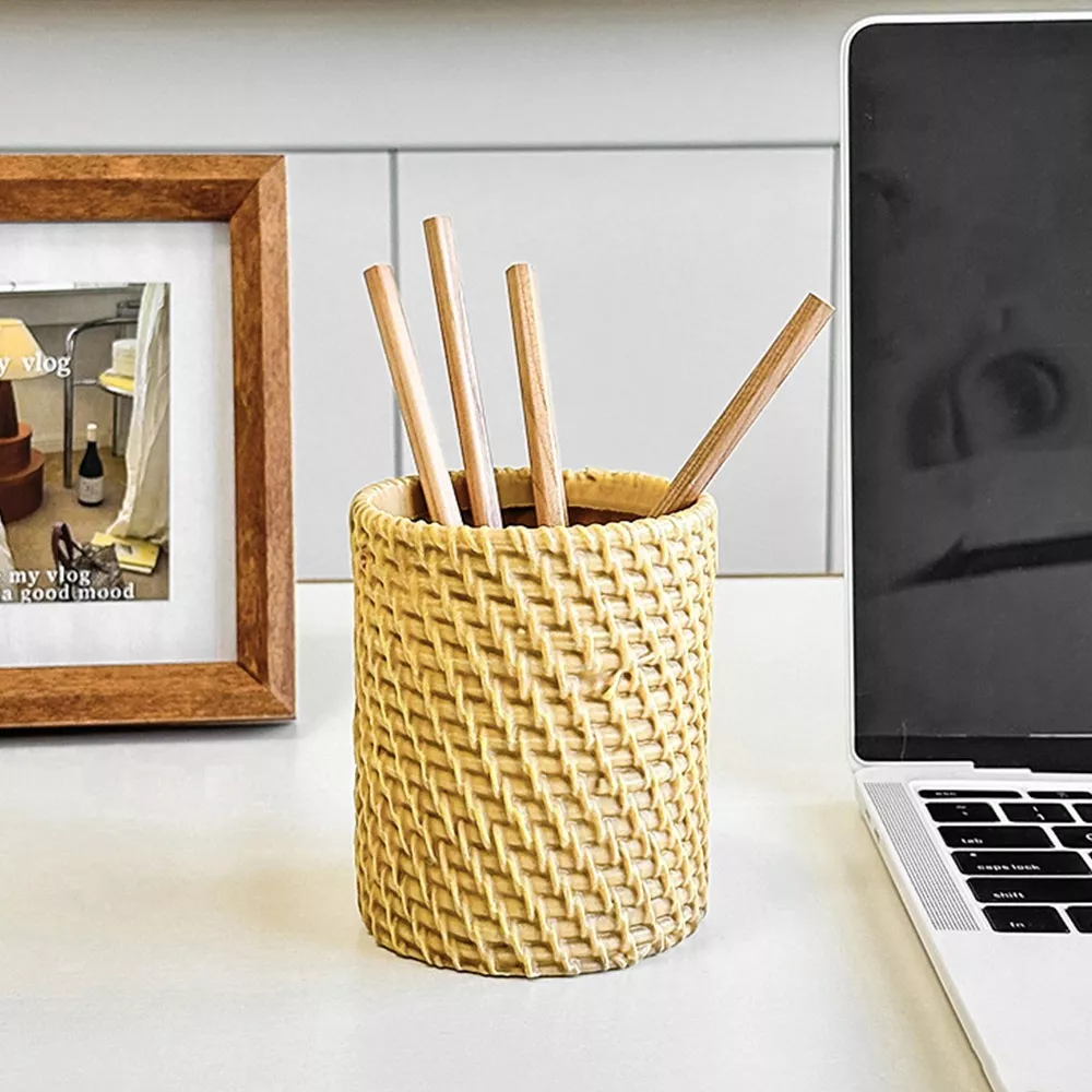 Bring a touch of simplicity and elegance to your workspace with this Minimalist Rattan-Style Pen Holder. Designed to look like woven rattan but made from durable plastic, this pen holder is the perfect mix of practicality and style. Measuring approximately 3.82 x 3.74 inches, it provides just the right amount of space for your pens, pencils, scissors, and other small essentials without taking up too much room on your desk.