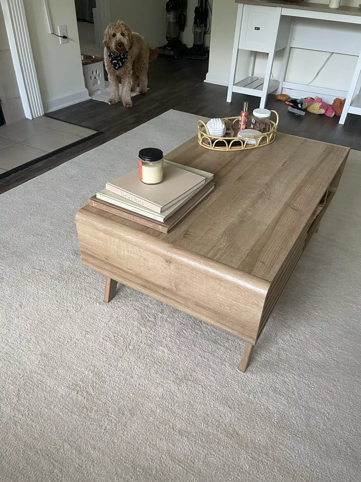 I totally smitten with this coffee table! It's an absolute game changer in my humble abode. What initially caught my eye was its dual storage system. Living in a small apartment, space is always at a premium and clutter just drives me up the wall. This table though? It’s like it cameoping down from the heavens save the day! The way that dual storage works is pure genius - it's practical yet unobtrusive which is exactly what you need when every square inch counts. You can stash anything from remote controls to magazines or even those pesky bills you'd rather forget about! And let's not forget about those unexpected guests who pop by; quick clean-up has never been easier. And then there's the style factor! This isn’t your run-of-the-mill piece of furniture we’re talking about here folks; this baby oozes class and sophistication without trying too hard. The design effortlessly fits into my existing decor while adding its own unique charm to the room. In short? My love for this coffee table knows no bounds! From saving me precious space with its clever dual storage system to standing strong through all sorts of use while looking absolutely fabulous doing so – what more could one ask for? If you're on the hunt for something functional yet stylish that adds a touch of elegance to your living area, look no further than this beauty right here!