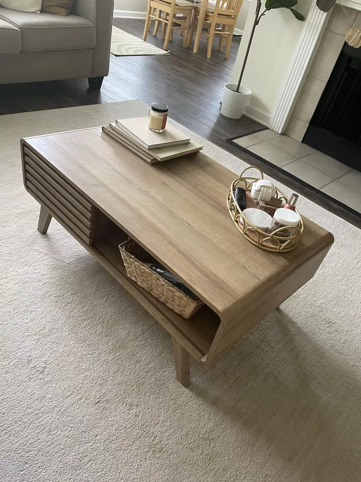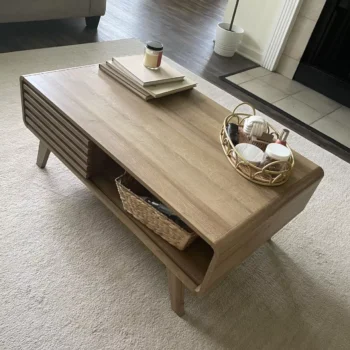 Transform your living space with our Mid Century Modern Coffee Table, the epitome of style and functionality. This chic rectangle coffee table combines classic aesthetics with modern design, making it a stunning centerpiece for any living room. Crafted from high-quality engineered wood with a sophisticated fluted oak finish, it offers both durability and a touch of elegance.