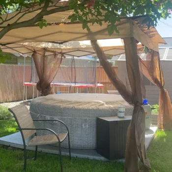 This garden awning has transformed our family gatherings! With enough space to comfortably accommodate six people under its ample shade coverage, we're able to enjoy meals outside without worrying about too much sun or sudden rain showers.