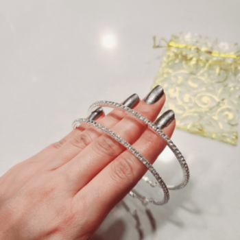 These earring are gorgeous they shine in any lighting and looks beautiful it’s very lightweight which I love begin that they are large hoops comfortable for all day wear u won’t regret buying it