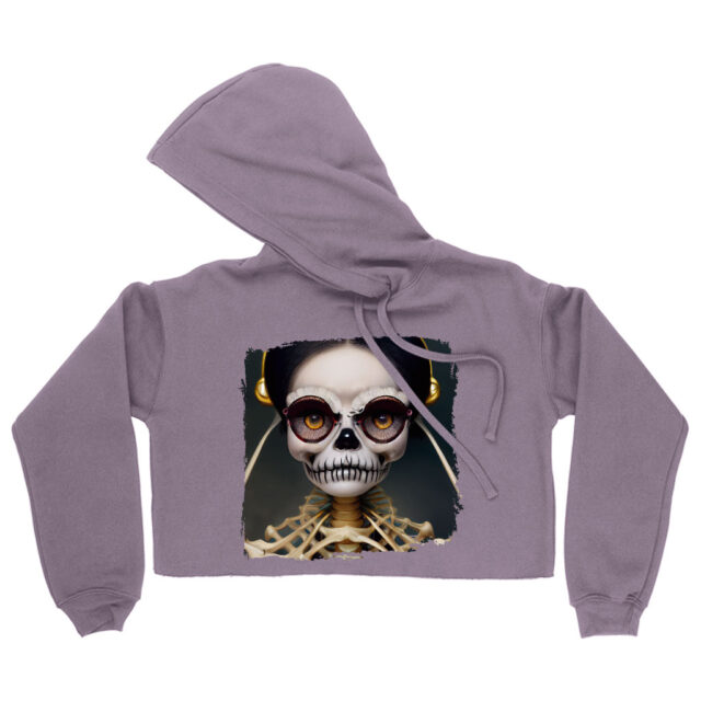 Skeleton Print Women’s Cropped Fleece Hoodie – Halloween Themed Cropped Hoodie for Women – Creepy Girl Hooded Sweatshirt