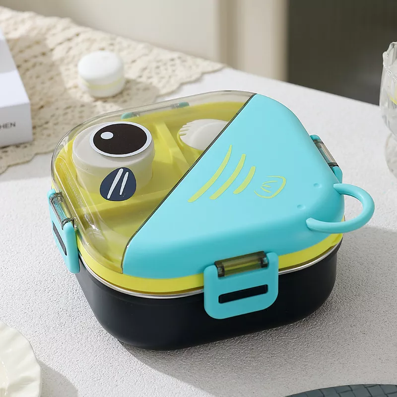 This adorable cartoon fish bento box makes mealtime exciting while keeping food fresh and organized. Crafted with high-quality 304 stainless steel and durable PP material, it ensures safety and longevity for everyday use. Its charming fish shape and vibrant colors – blue, green, and pink – make it perfect for kids who love fun designs. With a compact round shape, it’s lightweight, easy to carry, and ideal for little hands.