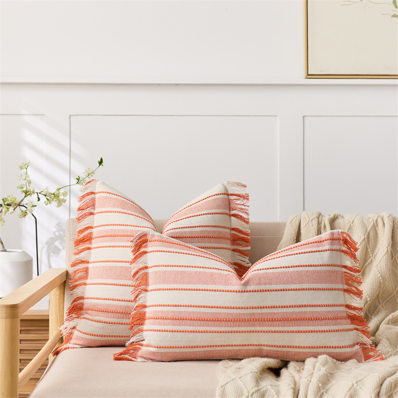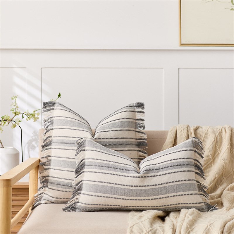 Refresh your space with the timeless charm of the Striped Jacquard Tassel Pillow Cover. Designed to blend comfort with effortless style, this cushion cover adds a touch of modern sophistication to any setting. Its beautifully yarn-dyed striped pattern and three-dimensional jacquard texture create a look that’s both cozy and chic—perfect for elevating your sofa, bed, or bay window nook.