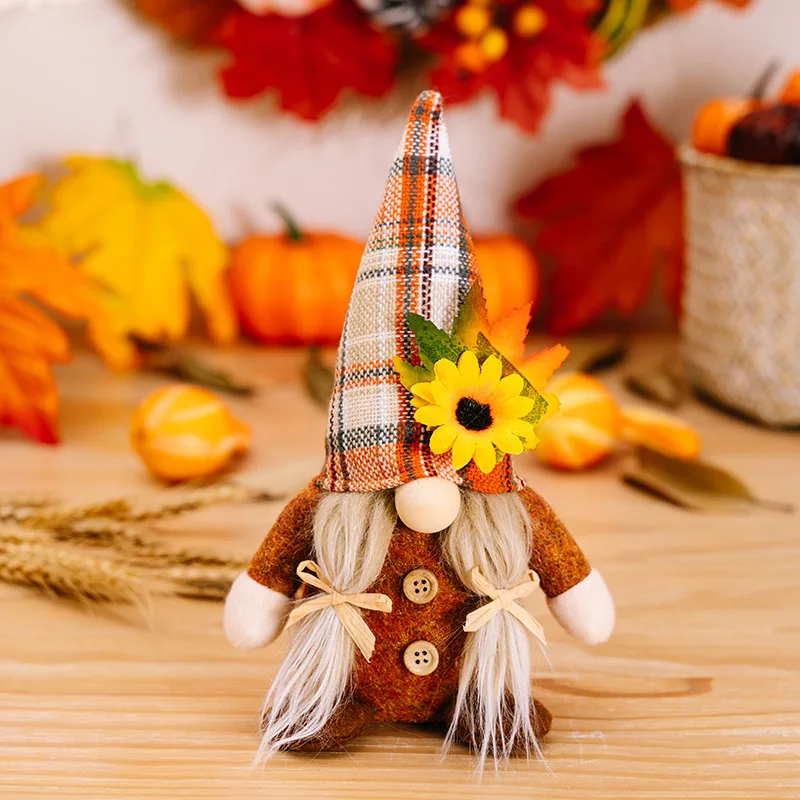 Crafted with care, each gnome features a charming beard, a pointed hat, and fine fabric detailing that evokes the essence of fall. The rich blend of orange, brown, and golden hues makes it a perfect accent for your Thanksgiving celebration or general autumn décor.