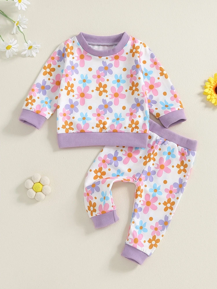 Toddler Girls Fall Outfit Set – Plaid & Floral Print Sweatshirt with Elastic Pants