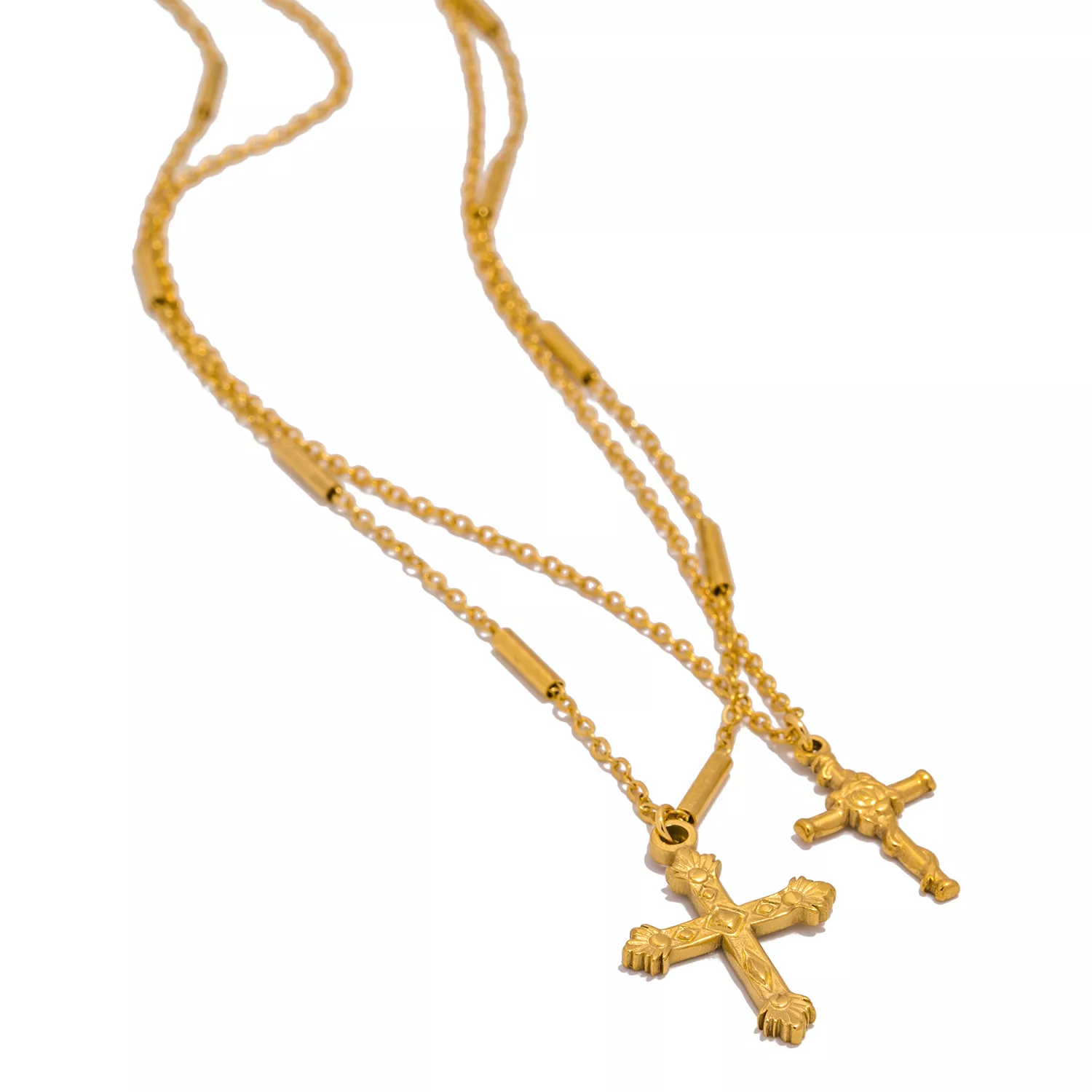 This double-layered cross necklace is not just a piece of jewelry; it’s a statement. The elegant design combines the charm of vintage style with the modern touch of stainless steel and real gold plating. Whether worn casually or for special occasions, it instantly adds sophistication to any outfit. The waterproof and rust-proof materials make it perfect for everyday wear, so you never have to worry about it losing its shine or tarnishing. The cross charms add a meaningful, spiritual touch that makes this necklace even more special.