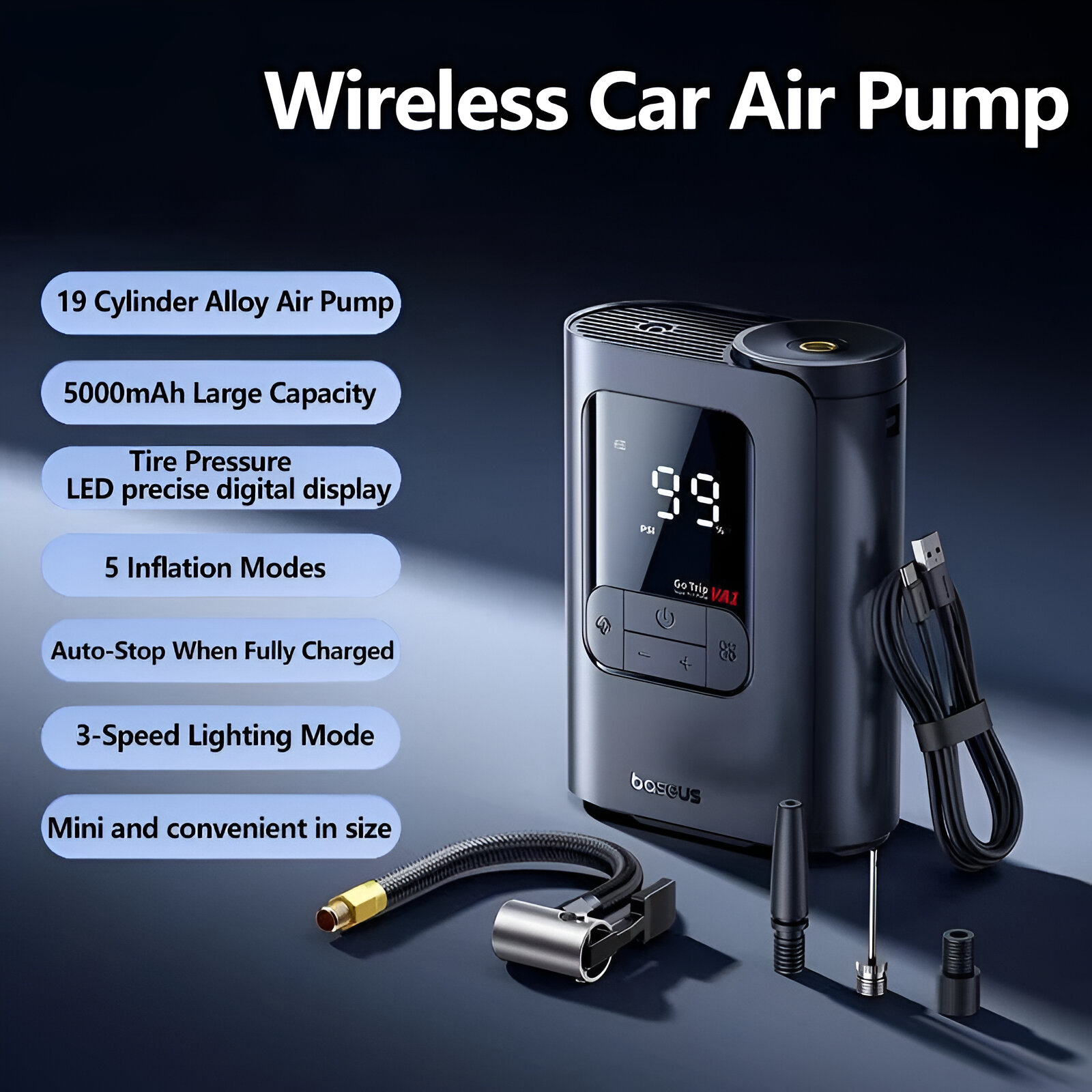 • One Pump for All: 5 smart presets for cars, bikes, and sports balls.