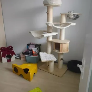 Our cat tree stands out with its five or more tiers of pure bliss for your cat. It’s constructed from high-quality wood and composite board, ensuring durability and longevity. The tree’s spacious condos offer the perfect retreat for your cat, while the scratching posts cater to their natural scratching instincts. As an added bonus, the tree includes playful accessories, making it an all-in-one entertainment and relaxation hub for your furry friend.